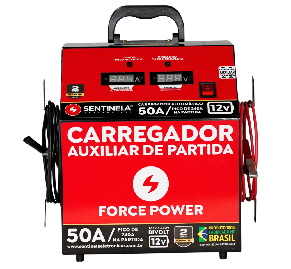 Corrente de saída: 50 amperes em 12v com pico 240 amperes na partida
